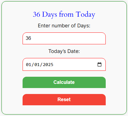 Don't worry! This calculator quickly determines the date 36 days ahead of any given start date. Whether planning an event or just satisfying your curiosity, this calculator will save time and effort.