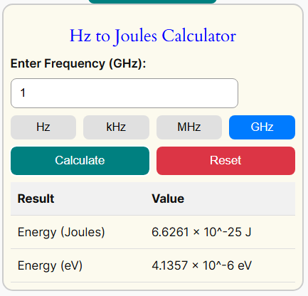 This Hz to Joules Calculator is a quick and accurate tool that converts frequency (in hertz) into energy (in joules and electron volts). It uses Planck’s equation E = h⋅f, where E is energy, h is Planck’s constant, and f is frequency. Simply enter a frequency value and choose its unit (Hz, kHz, MHz, or GHz) to get instant energy results.