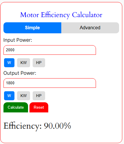 Looking for a reliable way to calculate motor efficiency? Our Motor Efficiency Calculator helps you determine motor efficiency using simple and advanced methods. Whether you have input and output power values or need to calculate efficiency using voltage, current, power factor, torque, and RPM, this tool has you covered.