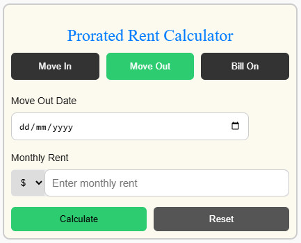 Simply enter your move-in or move-out date and the monthly rent to see the calculated result instantly. The tool also supports billing cycle calculations for properties that charge rent on a fixed billing day.