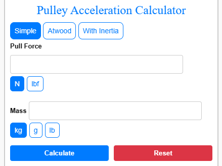 Understanding pulley acceleration is important when analyzing lifting systems, belt drives, or basic mechanical motion. This Pulley Acceleration Calculator allows you to evaluate how different forces and masses influence system movement under real working conditions. Whether you’re testing a simple pull force, studying an Atwood machine setup, or including pulley inertia for more realistic results, this tool helps visualize how acceleration changes.