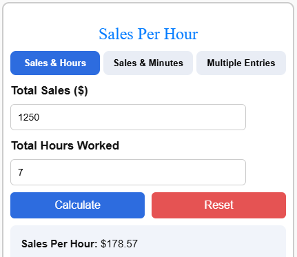 Simply enter your total sales and time worked to see the average sales rate per hour. You can also calculate sales using minutes or combine multiple sales entries for a more accurate analysis.