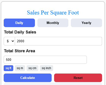 A higher sales per square foot value generally indicates better space utilization and stronger sales productivity. This calculator makes this process simple by allowing you to enter sales and store size while selecting daily, monthly, or yearly modes.