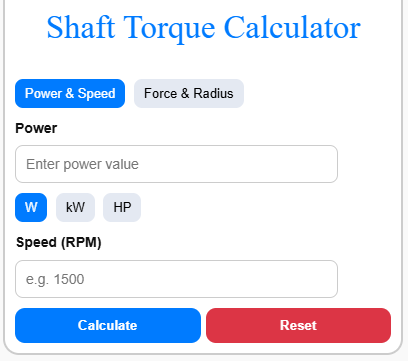This Shaft Torque Calculator is designed to make complex mechanical calculations simple and accessible for anyone working with rotating systems. It’s especially useful when you’re dealing with motors, shafts, or any rotating system and need a fast answer. This tool supports both power-based and force-based inputs. So you can use it in different real-world situations.